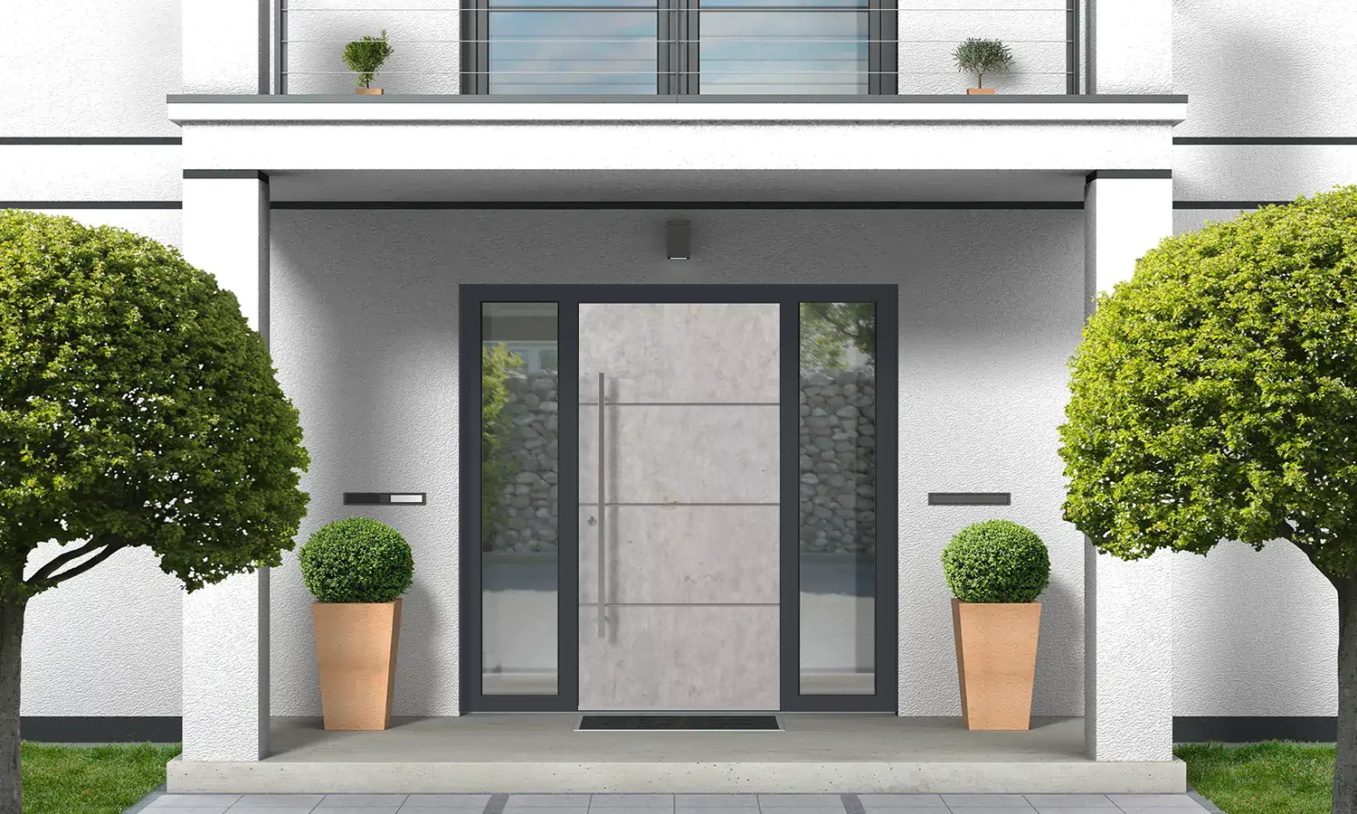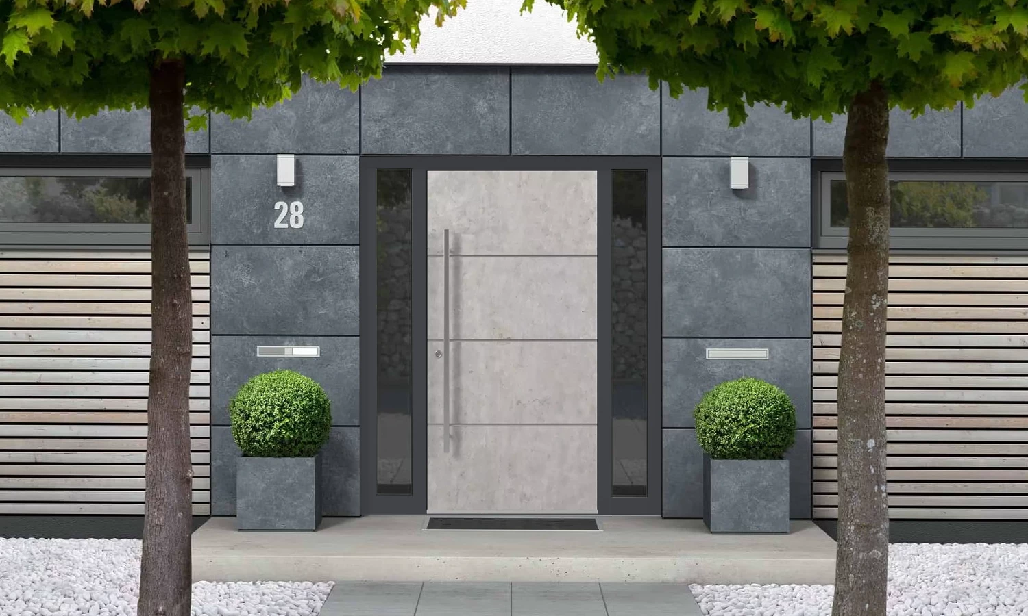 Drzwi model SK03 Beton 🏆 wyróżniają się wypełnieniem pełnym, co oznacza brak szyby czy przeszkleń. Zewnętrzna strona drzwi wykonana jest ze spieku kwarcowego. Wewnętrzne wypełnienie drzwi wykonane jest z panela aluminiowego. Drzwi te posiadają aplikacje ze stali nierdzewnej 3D, które nadają im nowoczesny wygląd.