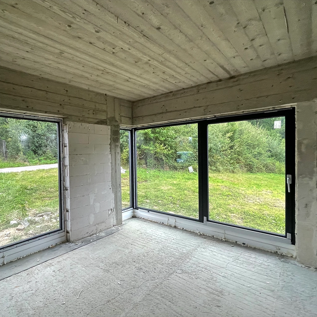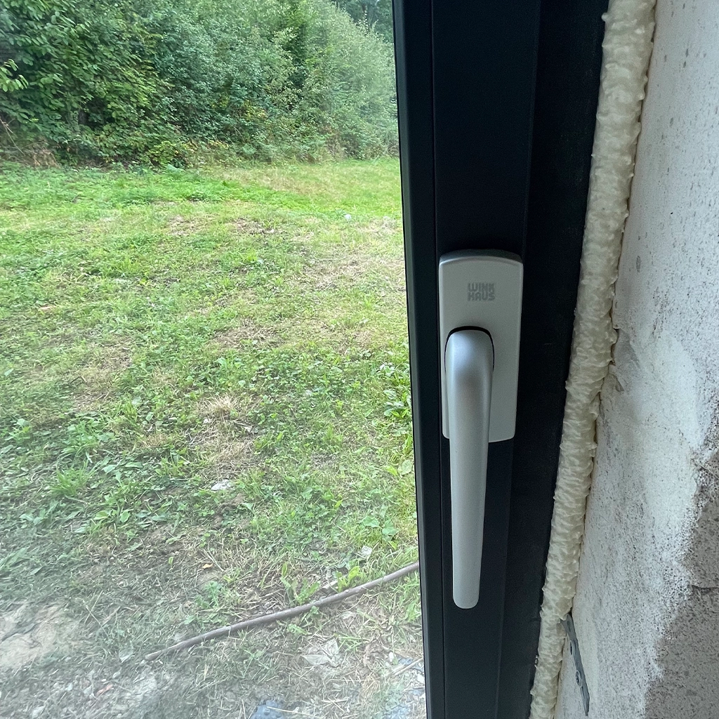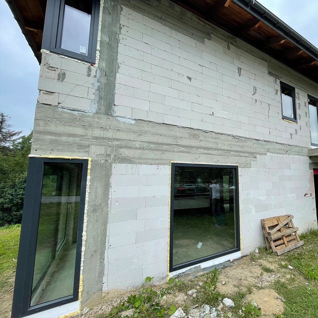 W domu zastosowano okna z serii Ideal 8000 firmy Aluplast, które słyną z doskonałej izolacyjności dzięki wykorzystaniu materiału PVC i potrójnego szklenia.Kolor szary antracytowy piasek dodaje nowoczesnego charakteru fasadzie, a funkcjonalność jest wzmocniona przez różnorodne typy okien: odstawno-przesuwne drzwi tarasowe PSK, rozwierno-uchylne okna, zarówno lewe, jak i prawe, oraz stałe szklenie w ramie.