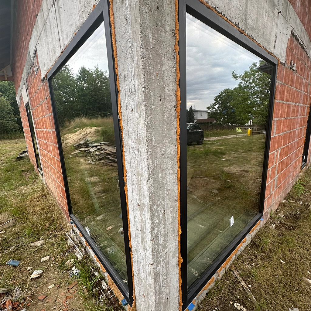 Zastosowane okna oferują różnorodne funkcje, od rozwierno-uchylnych po przesuwne, zapewniając zarówno funkcjonalność, jak i estetyczny design. Wykończone w kolorze Jet black aludec, okna te dodają elegancji i nowoczesnego charakteru bryle budynku. Dodatkowo, wyposażenie w mikrowentylację, blokadę błędnego położenia klamki, oraz ukryte zawiasy zwiększa komfort i bezpieczeństwo użytkowania.