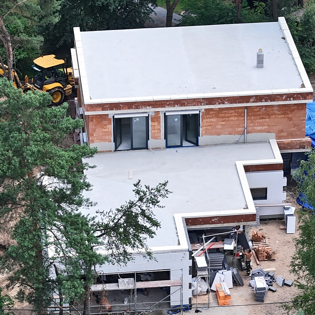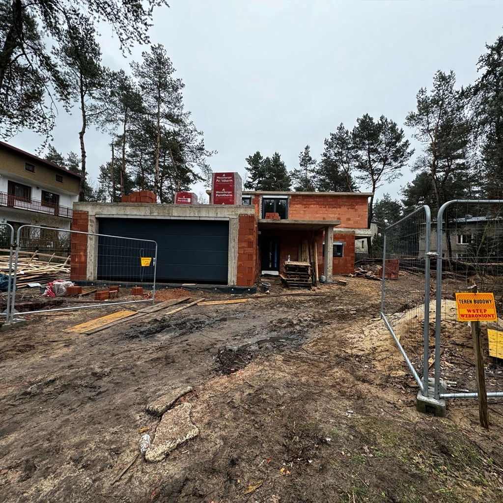 Dodatkowe funkcje, takie jak mikrowentylacja, ukryte zawiasy oraz blokady błędnego położenia klamki, zwiększają bezpieczeństwo oraz komfort użytkowania. Kolorystyka okien obejmuje elegancki szary antracytowy (RAL 7016) oraz ciepłe parapety i ramki w kolorze czarnym, co dodaje elegancji fasadzie. Klamki w modelach SecuForte Toulon i HS Dublin w srebrnym wykończeniu podnoszą estetykę, a rolety podtynkowe Aluprof i napęd siłownikowy serii YYGL z przełącznikiem DC318 dopełniają nowoczesny charakter domu.